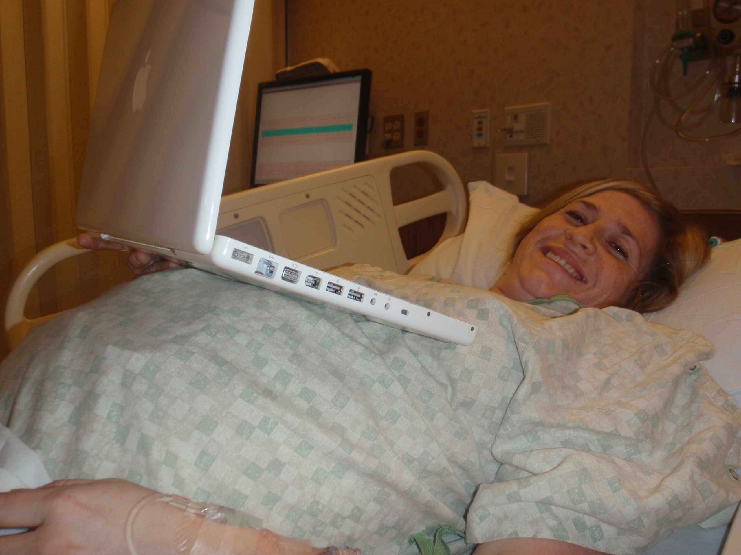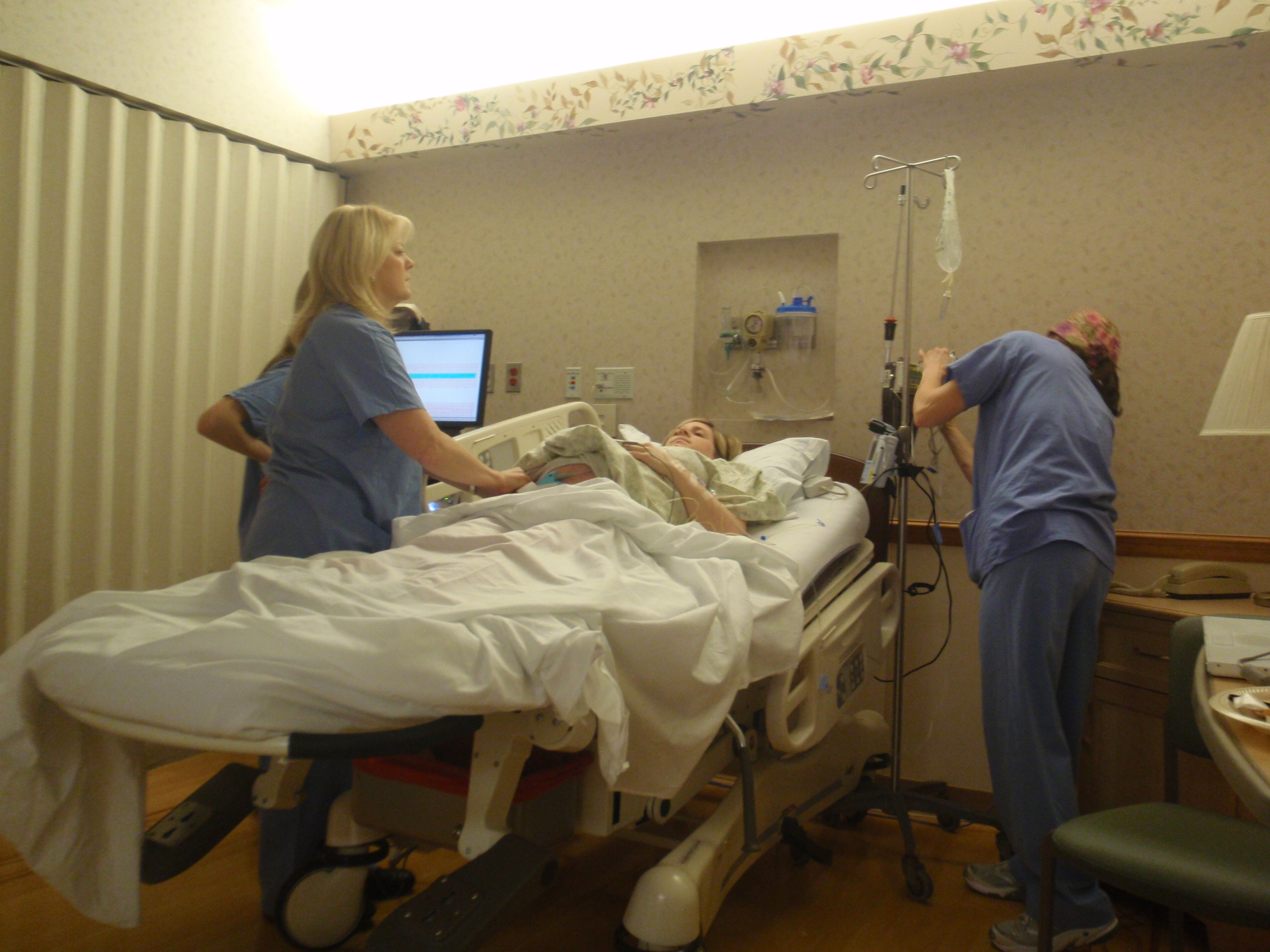 Dr. Blake was here and did a checkup. She will be delivering later today, Jamie is excited. Turned up the IV and soon after will be the Epidural. Jamie is in a little pain.