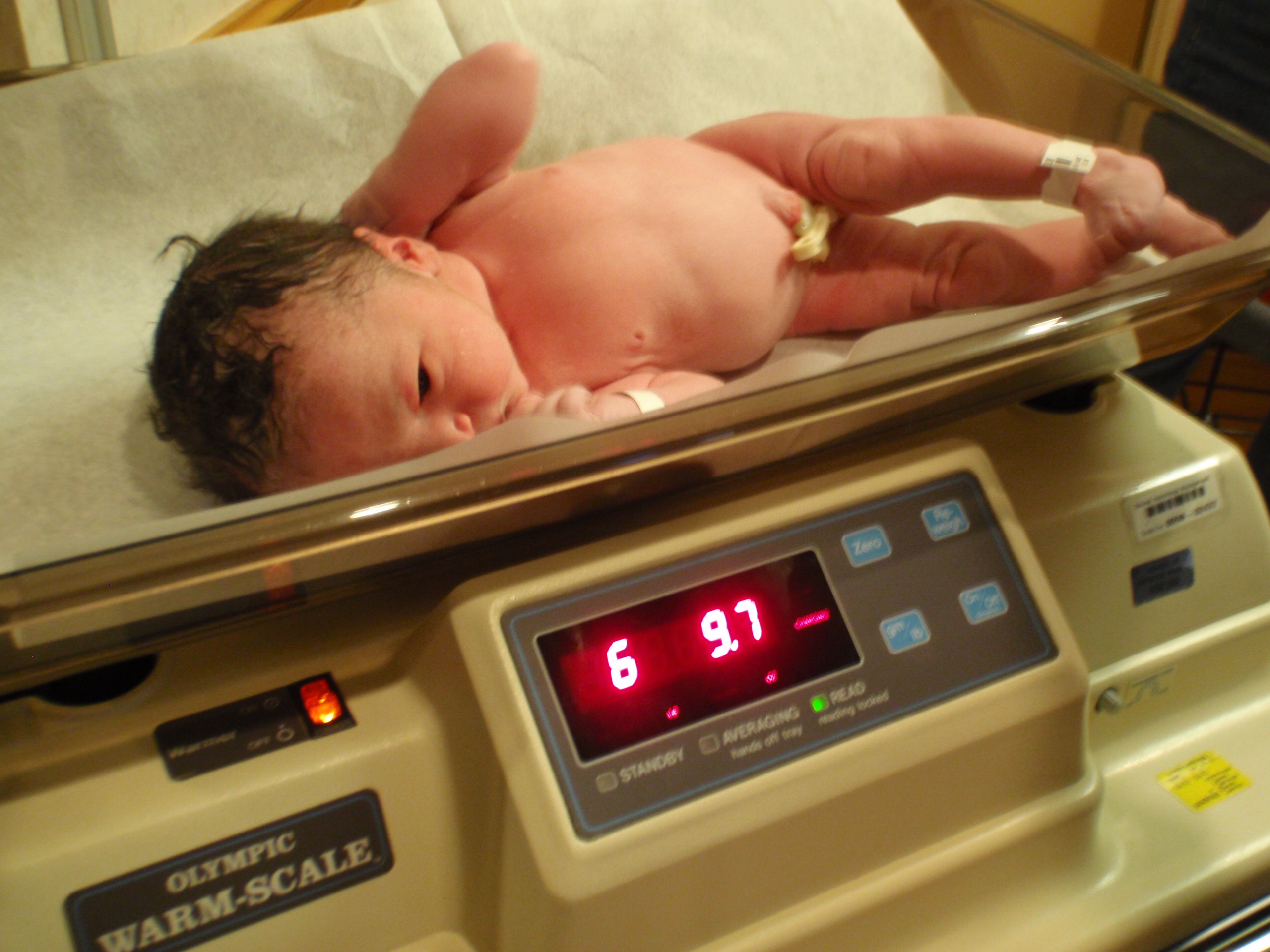 She is an hour and a half old. Measurements are 19 1/2 inches long, 6 Pound 10 Ounces, 13 1/2 inch head