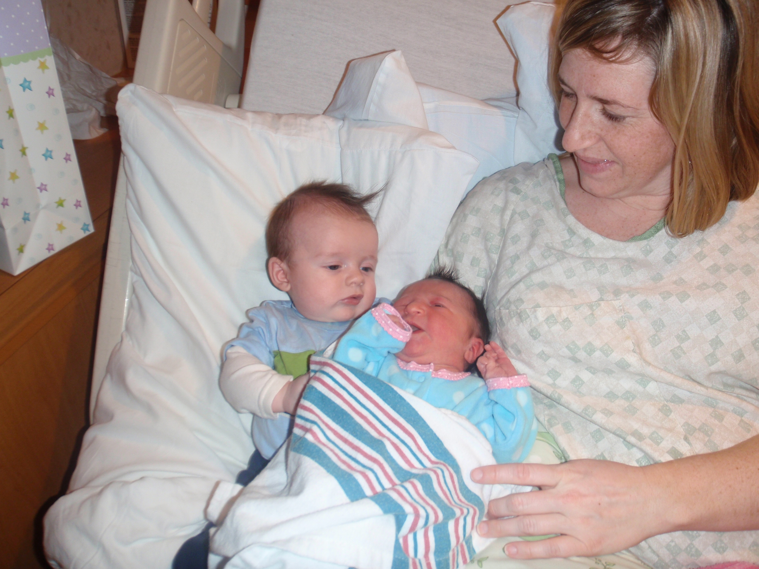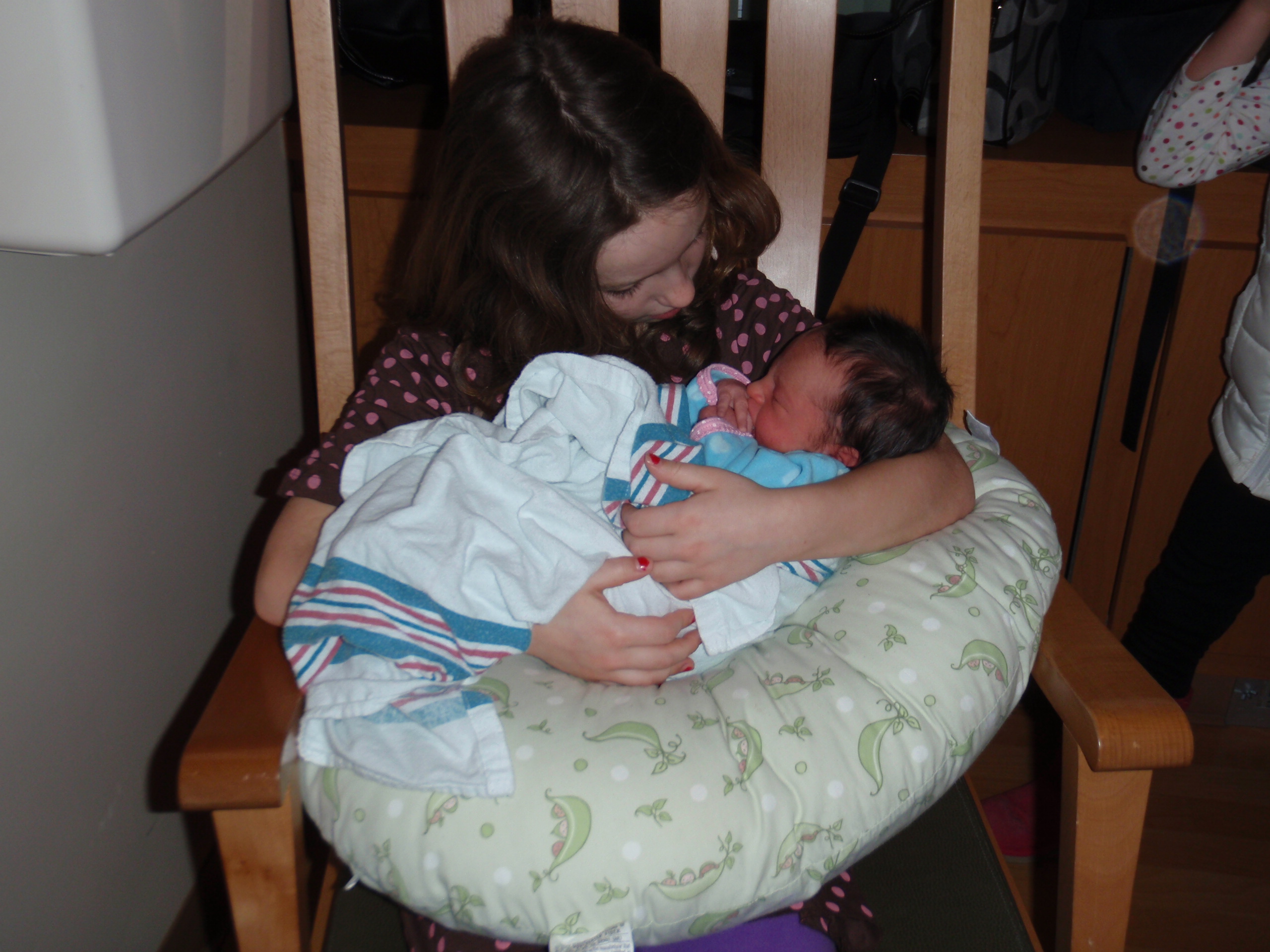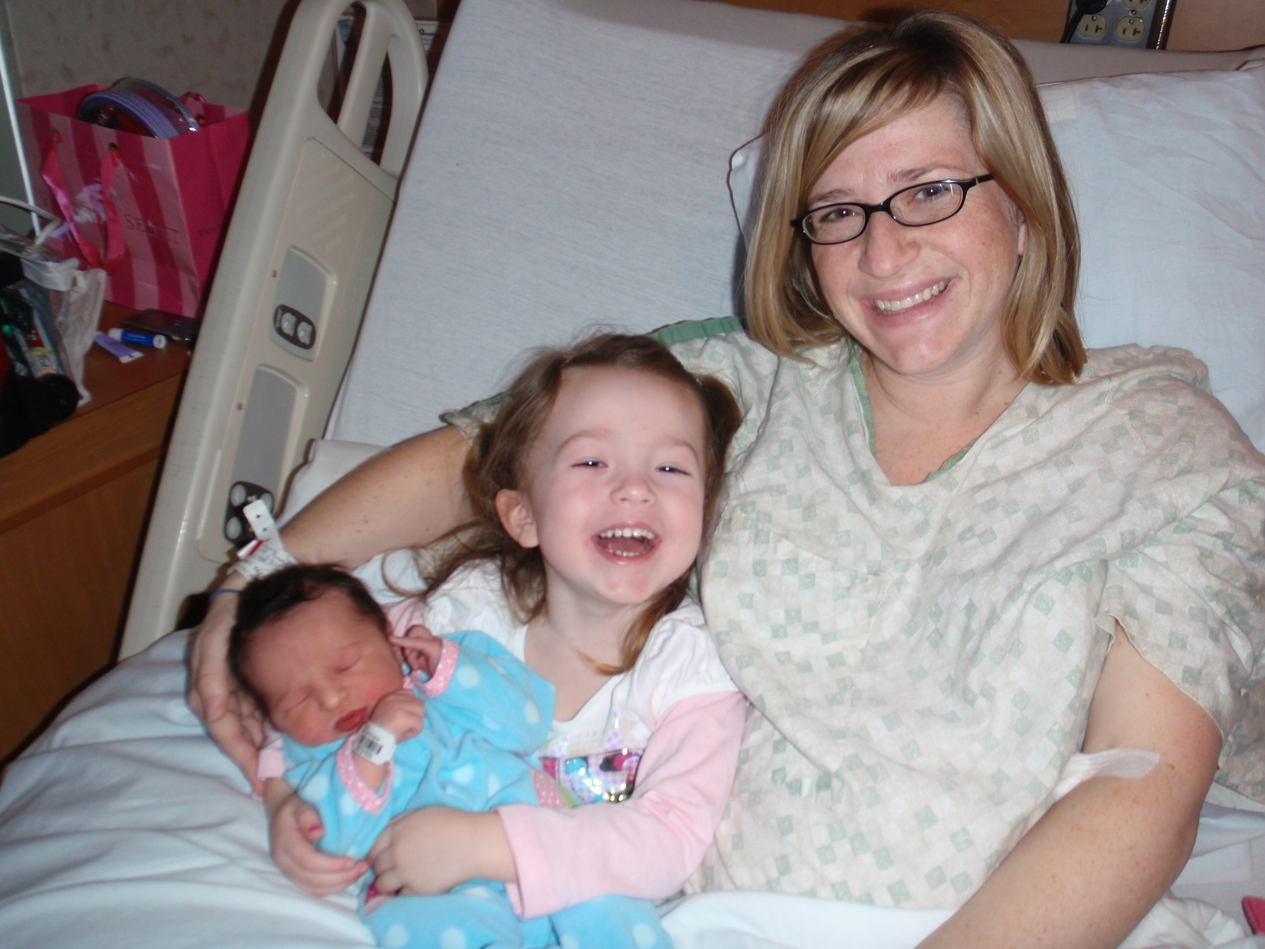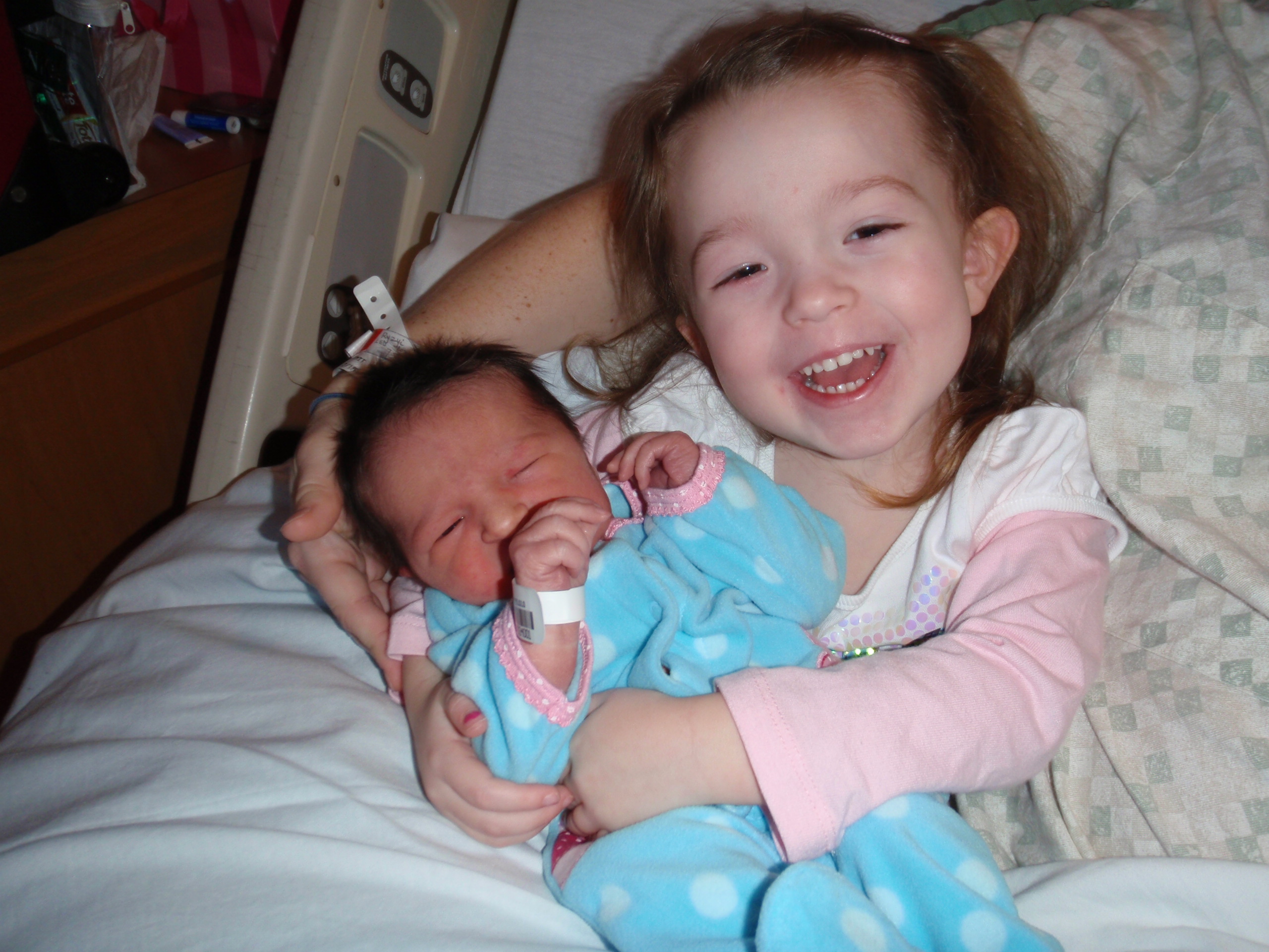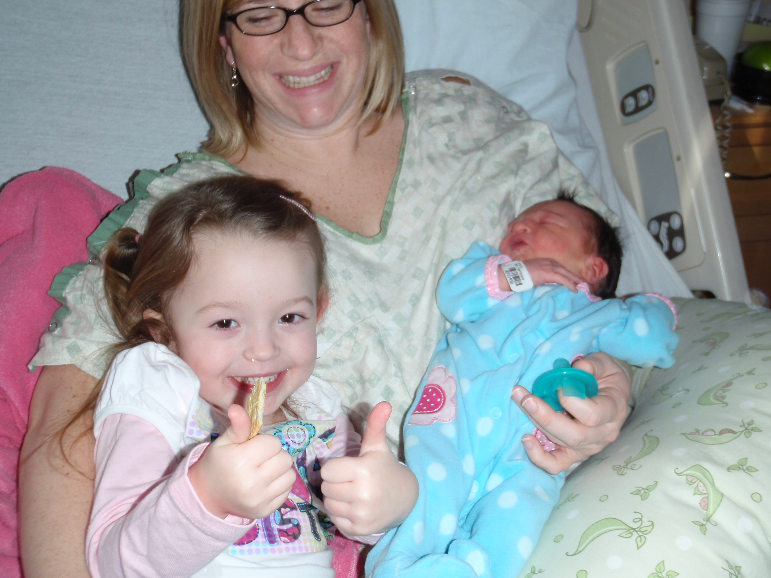 Big sister Ellie and Grandma Aurelia got here around 12:30 today. Ellie was able to hold Leah and she brought her a pretty lamb. Leah gave her big sister 2 presents back as well. Everyone is so happy.
