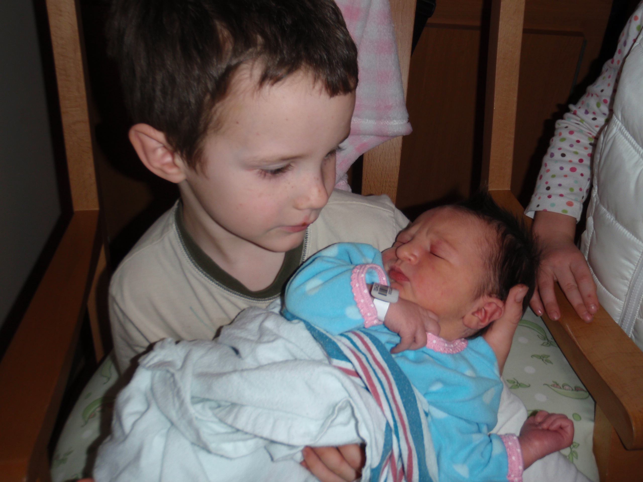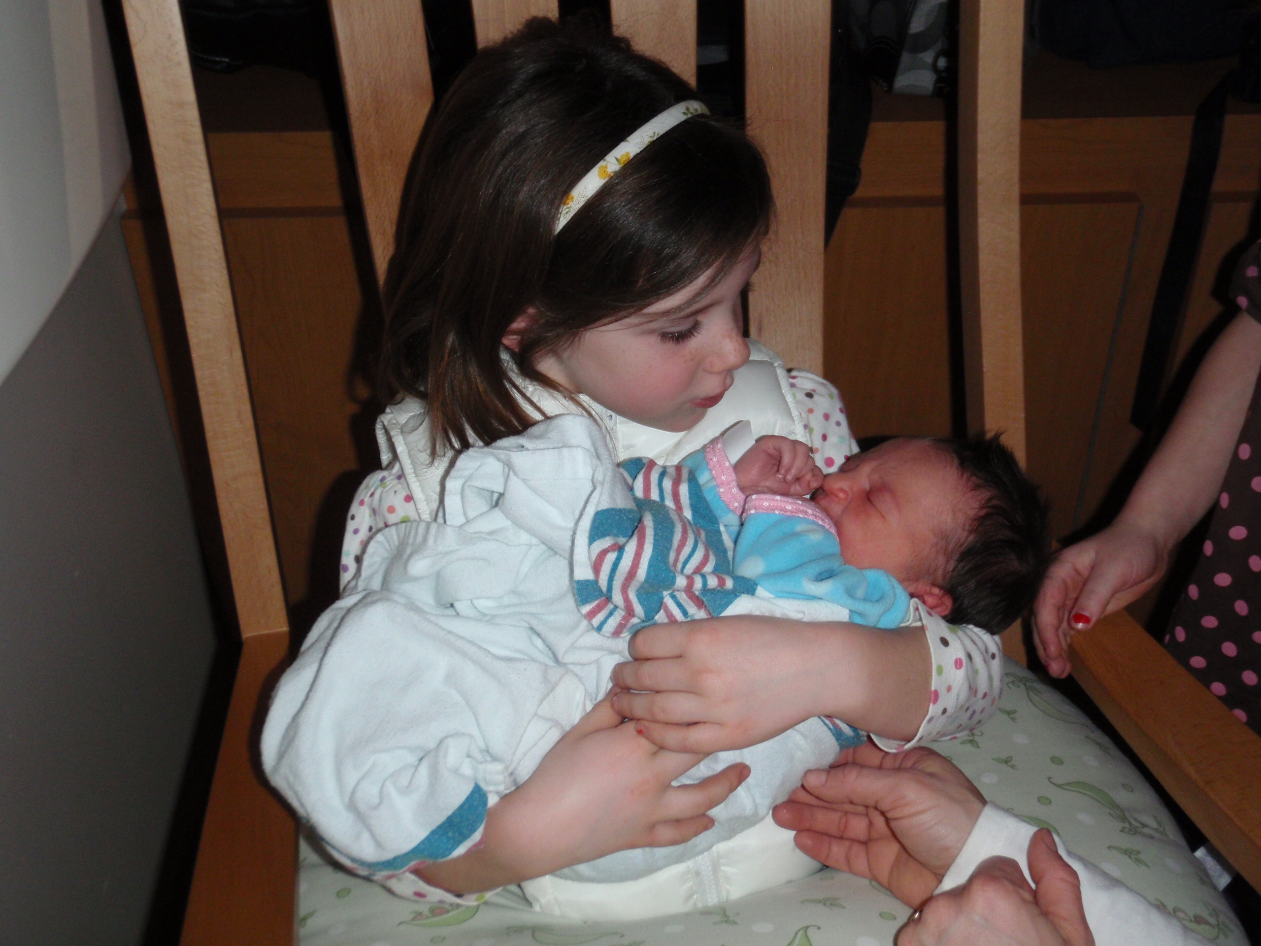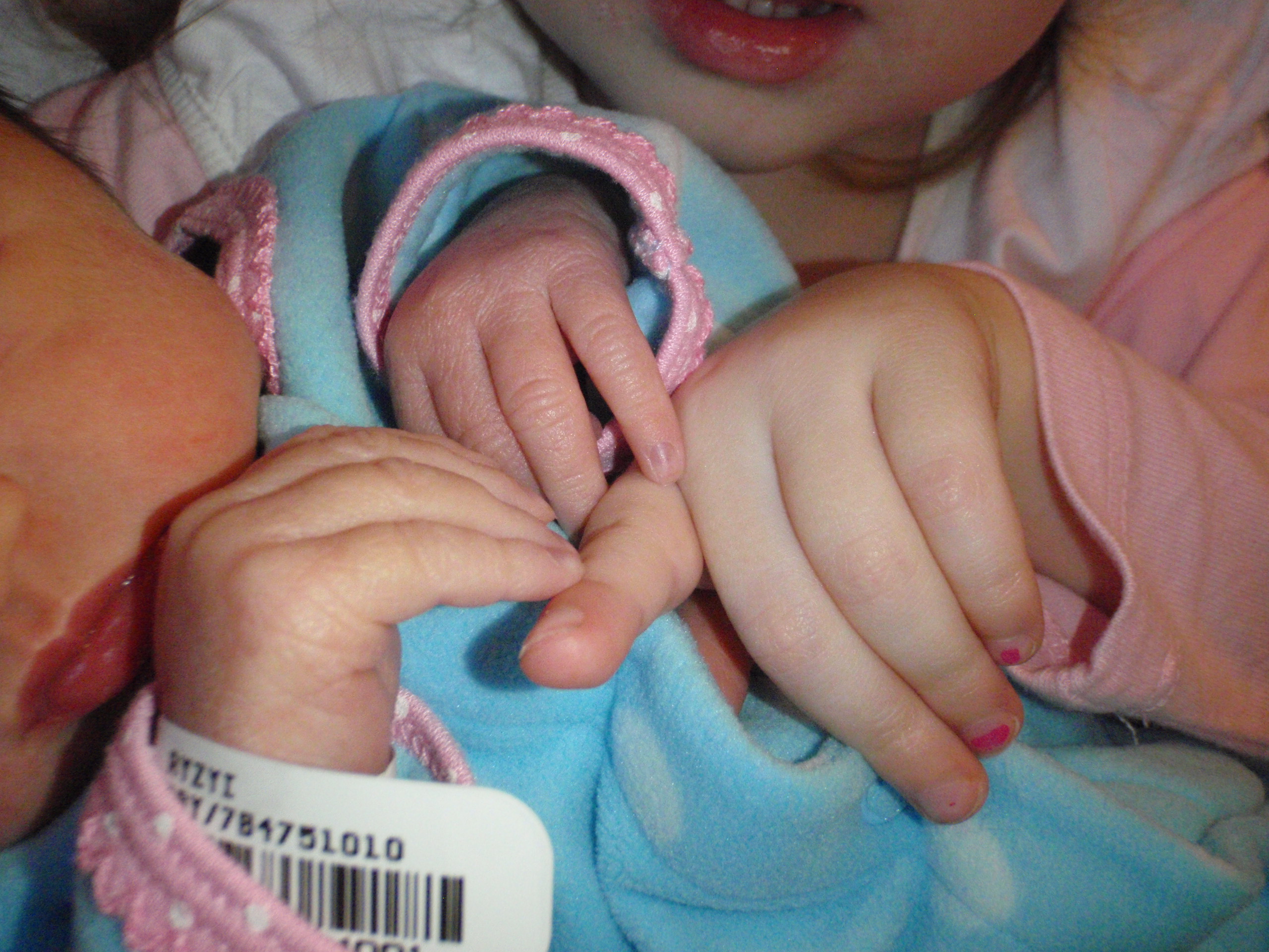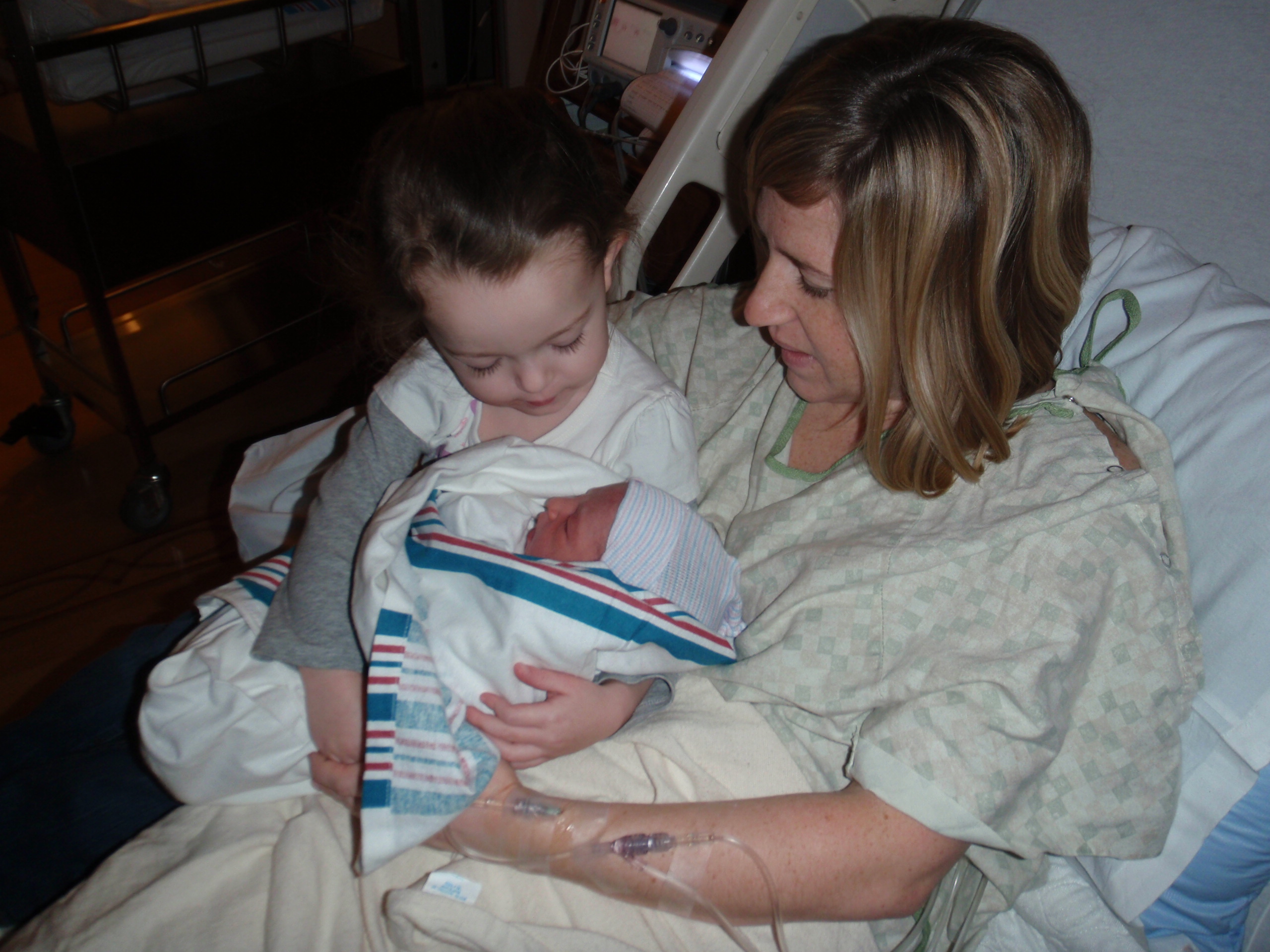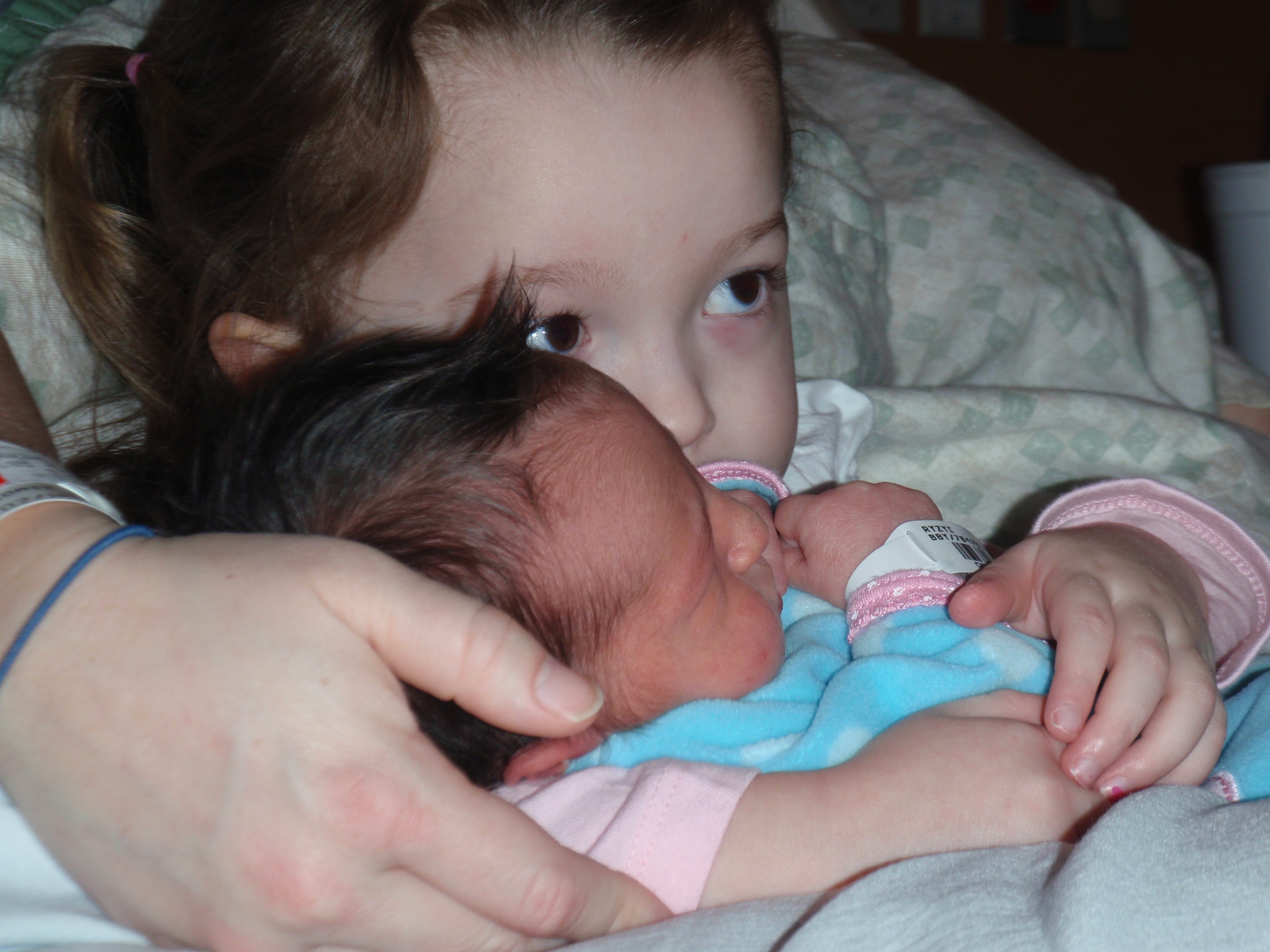 Big sister Ellie and Grandma Aurelia got here around 12:30 today. Ellie was able to hold Leah and she brought her a pretty lamb. Leah gave her big sister 2 presents back as well. Everyone is so happy.