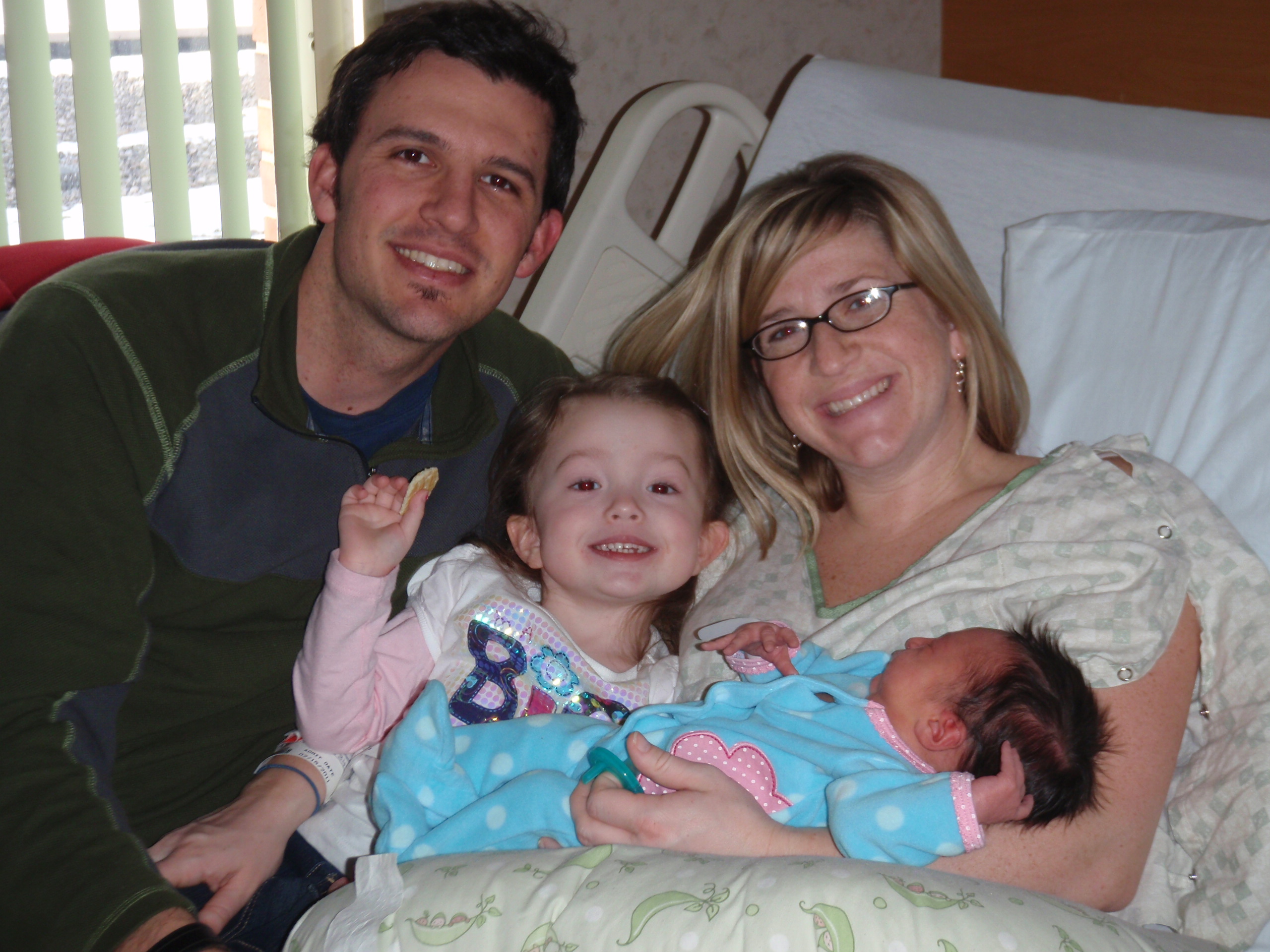 Leah has been sleeping for the past 3 hours. We have had all grandparents stop by, Jamie's Aunt Jane and cousin Kasie too. Ellie came by with Jamie's parents and sister Jess. When she first saw Leah she was hesitant but then held her baby sister and was very excited. Ellie asked "is Leah coming home with us"? Not tonight sweetheart but very soon we will all be home.
