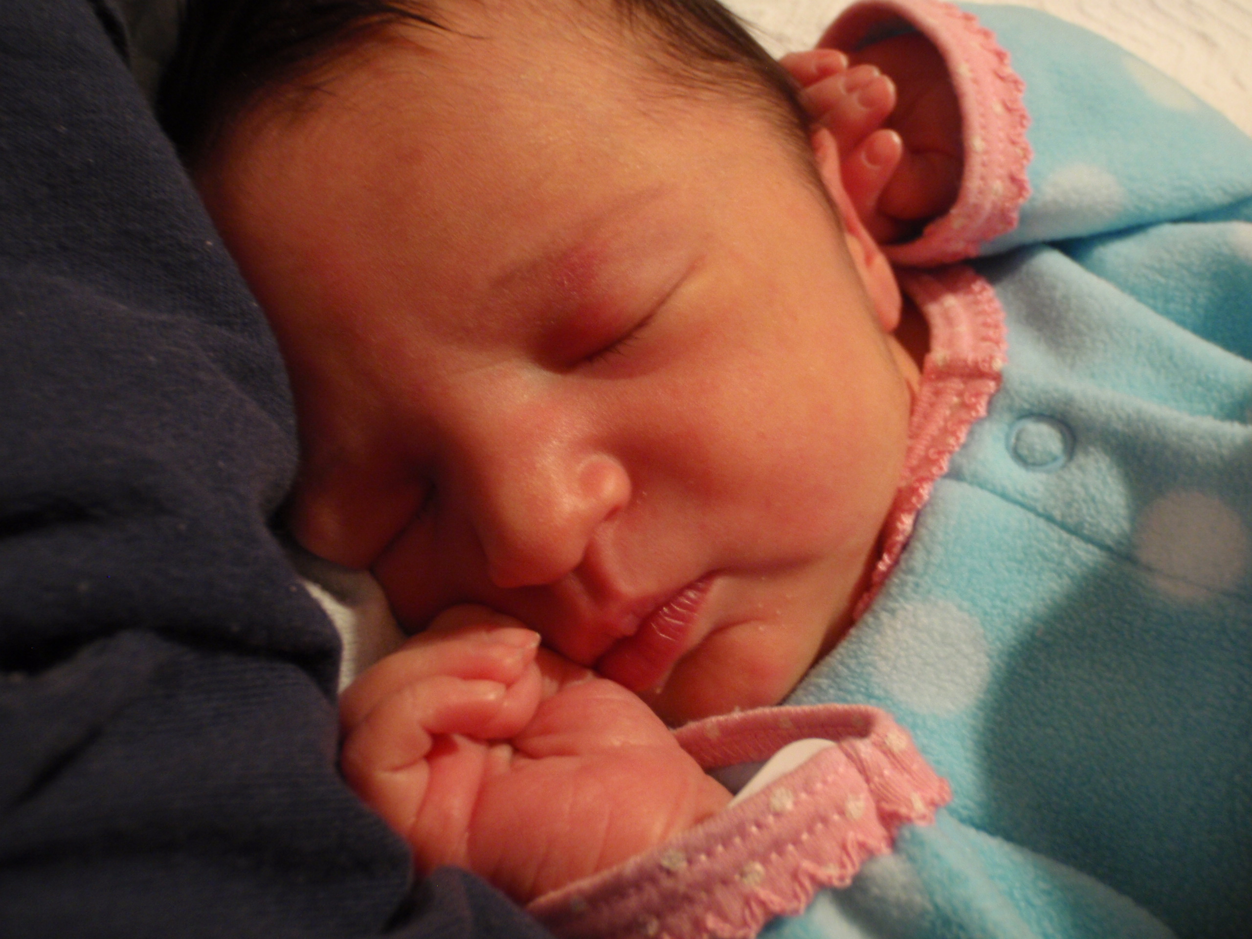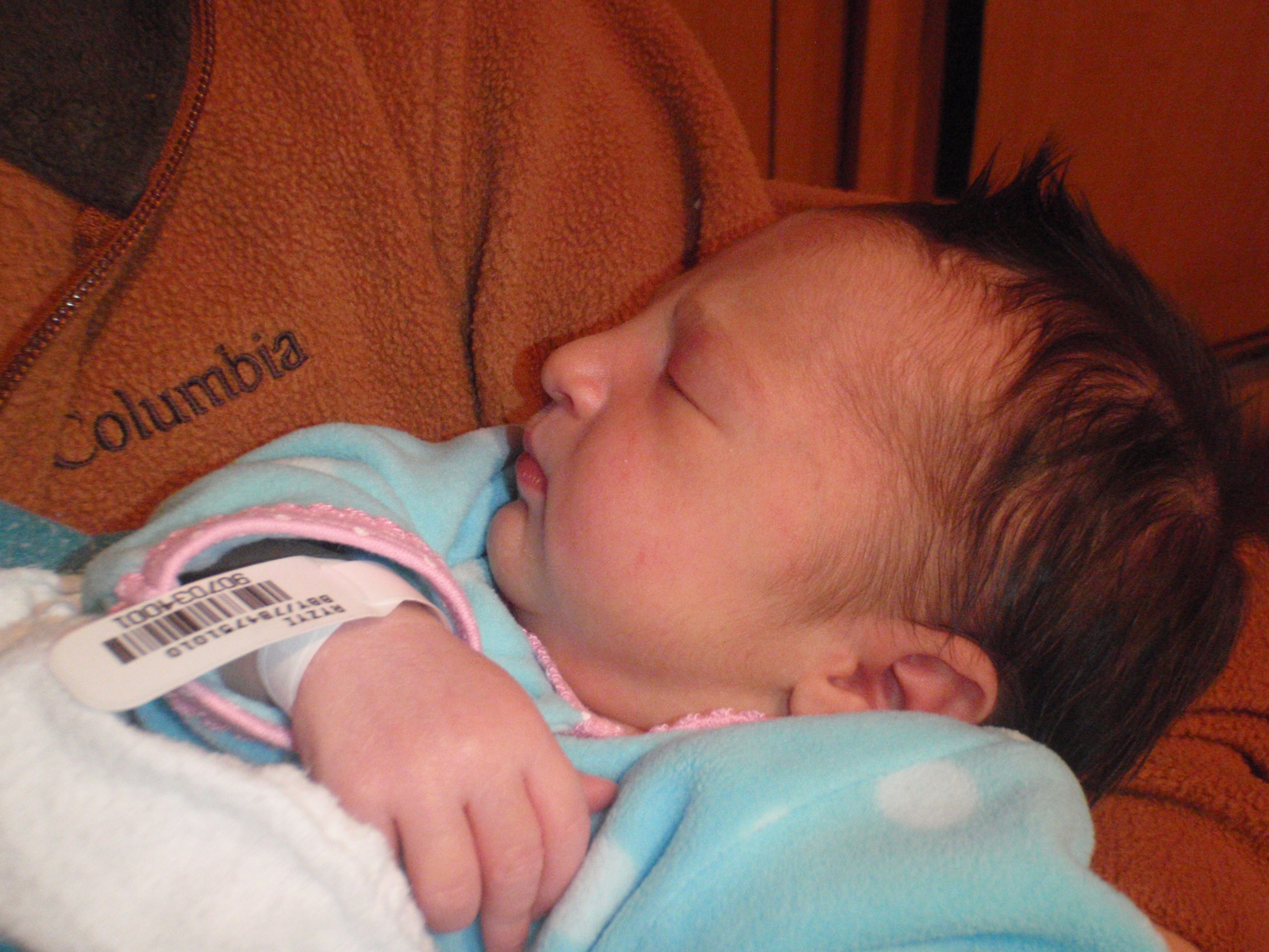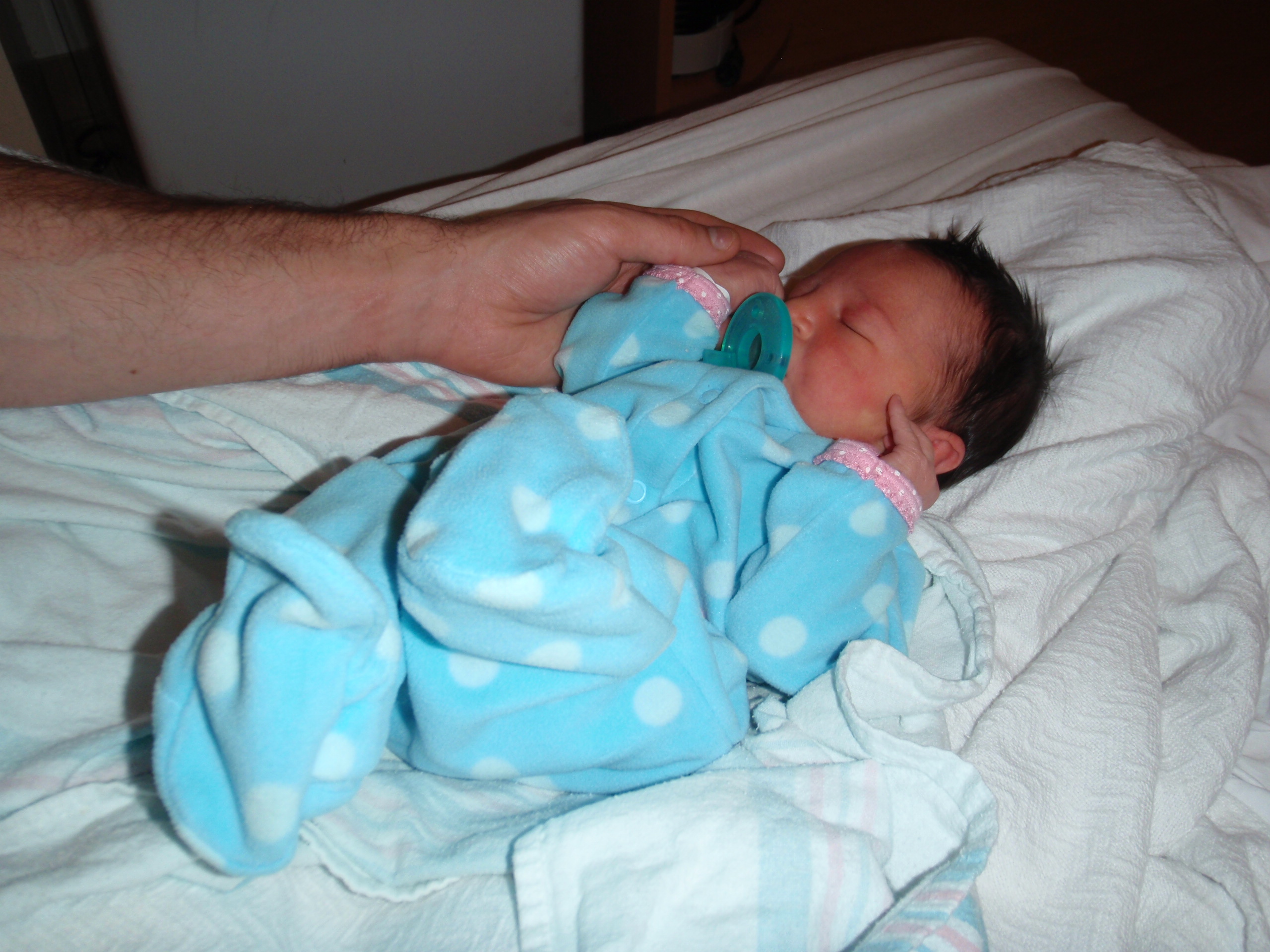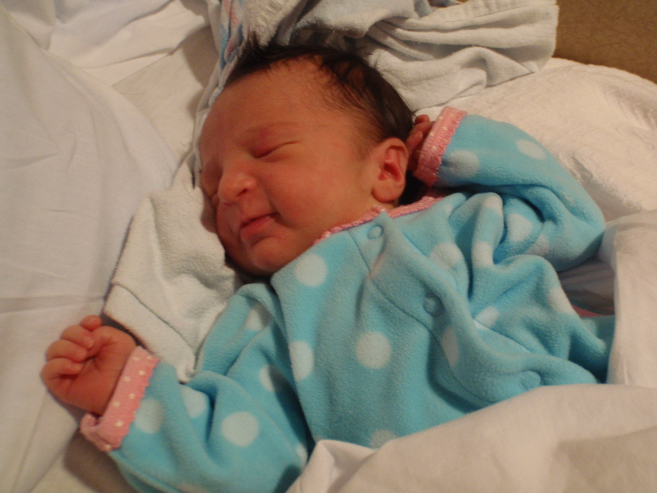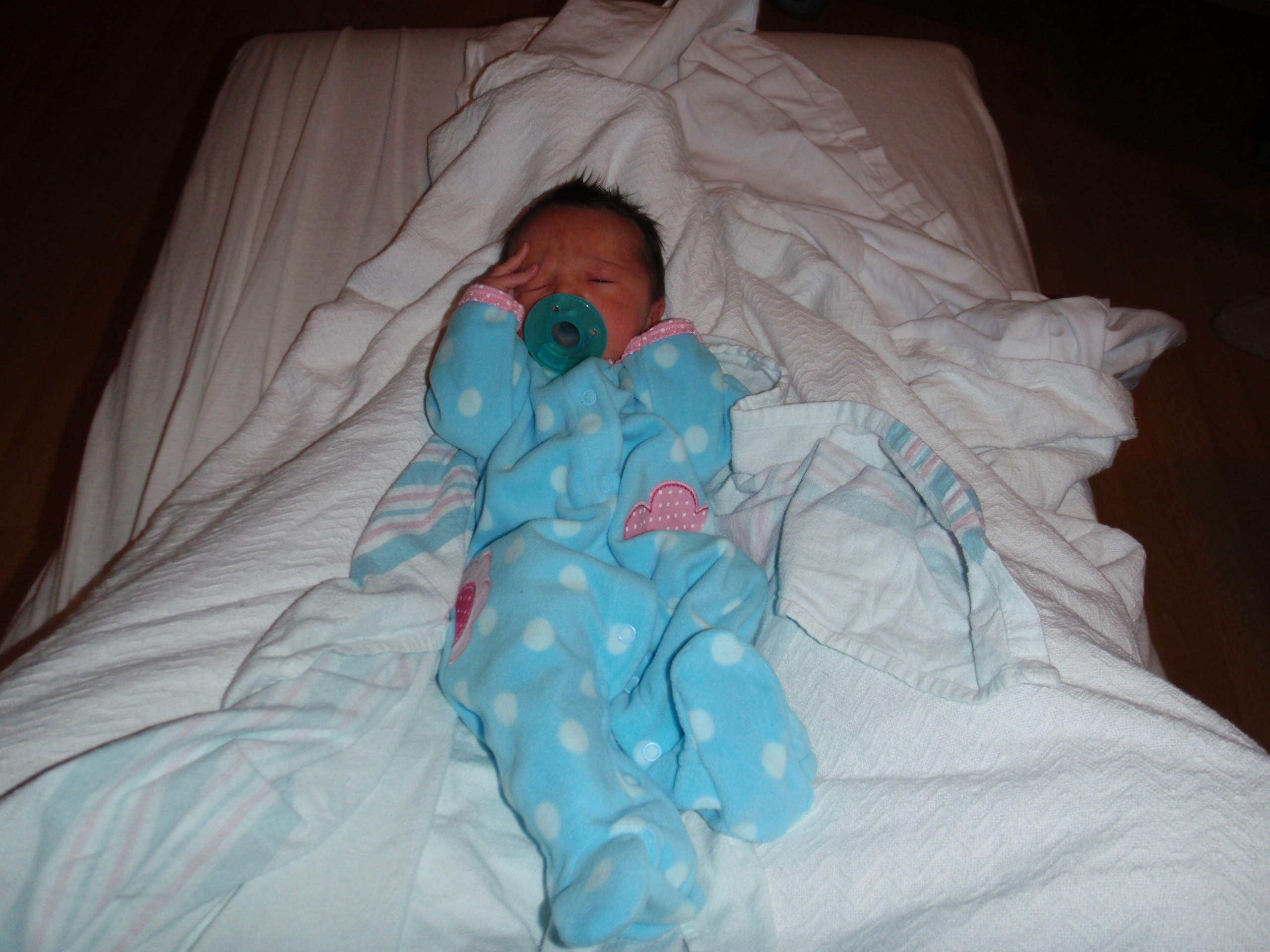 Baby Leah slept very well throughout her first night. A few diaper changes and overnight feedings and as I type a few little toots with her sleeping on my chest. Speaking of Mom and Dad are doing great trying to catch up on some shut eye while we can. More pictures and updates in a little bit.