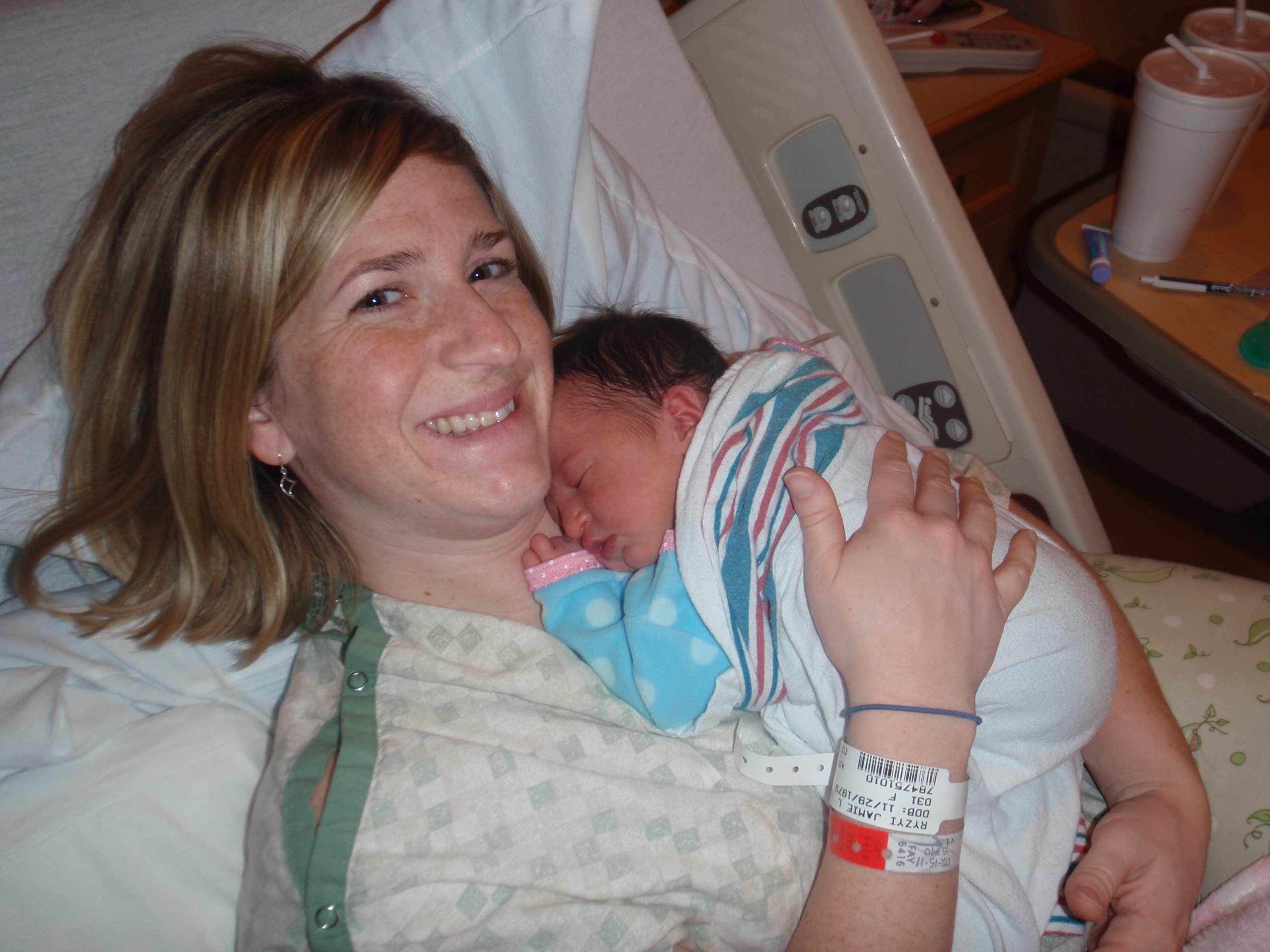 Last post of the night... Leah has been nursing and sucking on a pacifier for over two hours. We decided that she is hungry and not getting enough from Jamie. We had nurse Linda bring us some organic Similac formula. Daddy was able to help out and feed her almost the entire 2oz bottle. She is now sleeping soundly with a full little belly. Good night everyone!