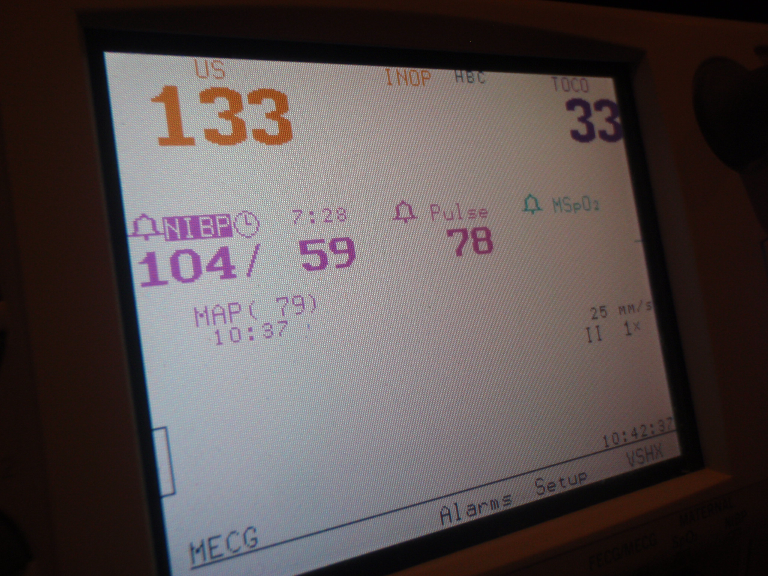 Turned up the Pitocin to aide in progression. Jamie feels good but very tired. She is having trouble sleeping because every thirty minutes the nurses are back to move/change/poke/adjust something. 11:30 is the next checkpoint, then it's time to roll on her side for a bit.